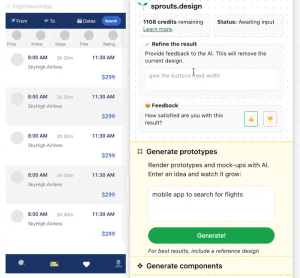 Powered by the latest AI models, the sprouts.design AI takes your input and generates a prototype—all backed native components in Figma.
